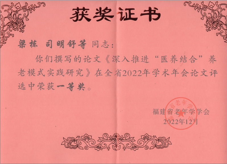 2022年12月,福建省老年学学会公布《福建省老年学学会关于表彰 2022 年学术年会优秀论文和优秀组织奖的决定》 。截至2022年8月底,其共收到征文525篇,省学会组织专家对收到的征文进行全面评审,评选出160篇优秀论文。其中公司健康养老管理研究中心梁栋副教授团队撰写的《深入推进“医养结合”养老模式实践研究》荣获一等奖。梁栋副教授还受邀参与本次年会的主旨演讲。
