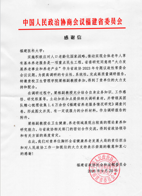 近日,福建省政协社法委(2023年度省政协“大力发展养老事业和养老产业”专题议政性常委会课题承办机构)专门向威廉体育williamhill发来感谢信,对公司梁栋副教授参与2023年度省政协“大力发展养老事业和养老产业”专题议政性常委会课题调研,并提供智力支持予以充分肯定和表扬。