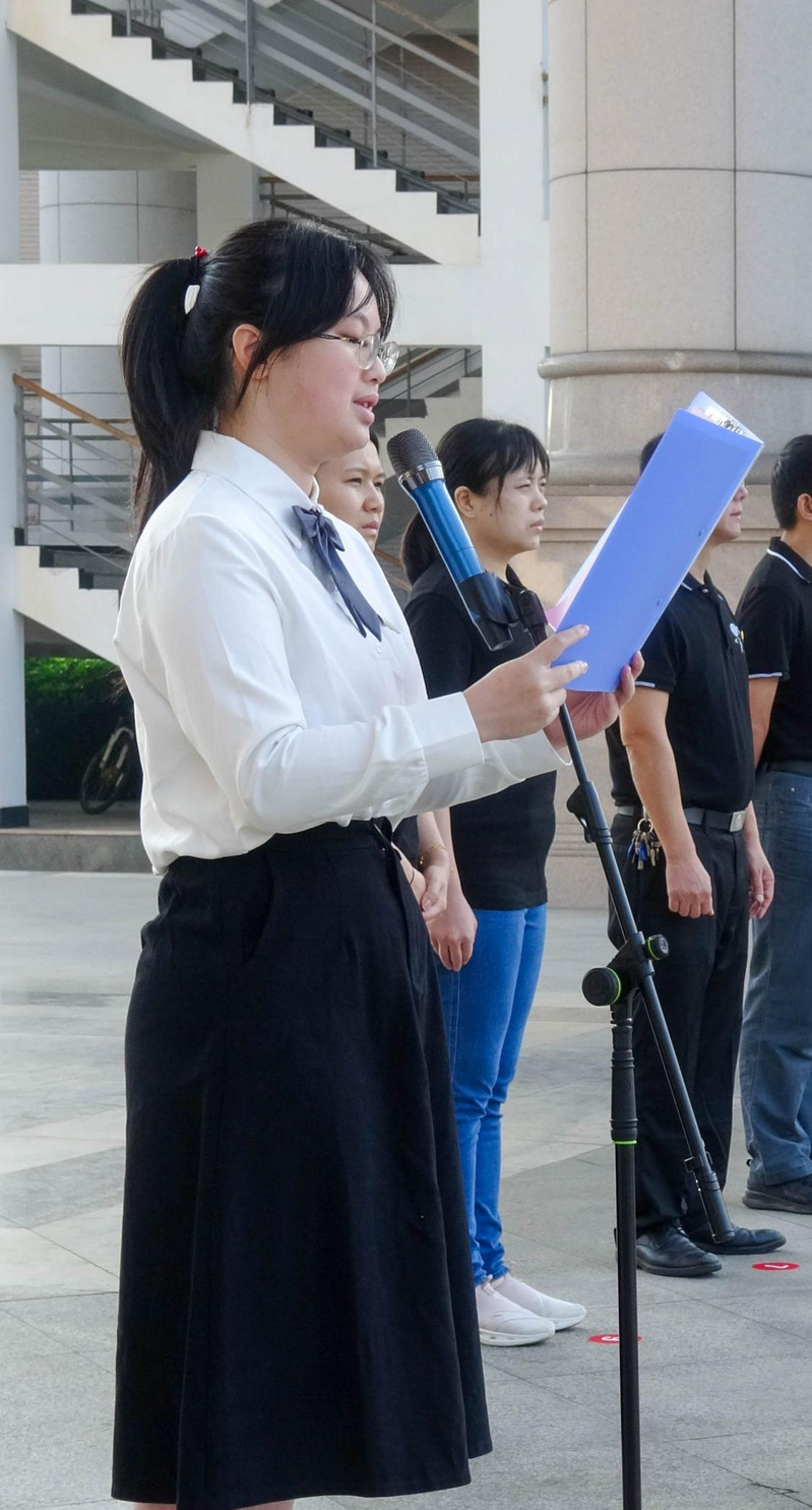 升旗仪式伊始,五星红旗首先在公司国旗护卫队队员的护卫下进场。当国歌响彻校园时,国旗全体师生的注目下冉冉升起。礼毕,2023级员工代表黄子琳同学做国旗下讲话,她号召全体同学带着青春热情追逐未来,以昂扬的姿态为祖国发展贡献力量矢志奋斗