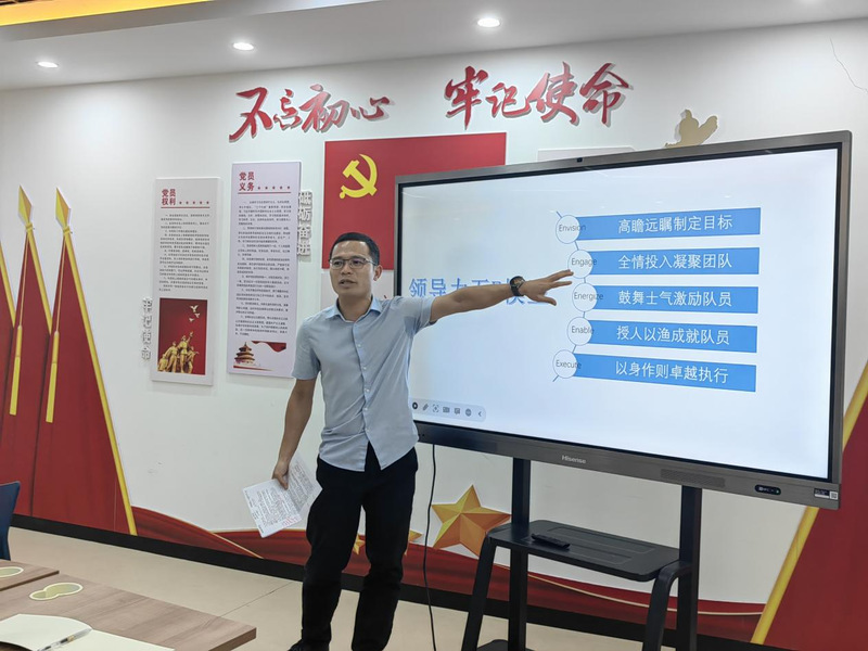 蔡皇界老师以“员工干部骨干的领导力”为题,结合自身员工干部和工作岗位的成长经历和感悟,立足员工干部领导力提升,具体阐释了领导力五力模型与五E模型,并通过理论与案例相结合,详细介绍了员工干部骨干领导力应重点强化学习意识、闭环意识、执行意识、团队意识和模范意识,多层次全方位地分享员工干部骨干领导力的提升途径。
