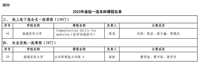 近日,福建省教育厅公布2023年省级一流本科课程名单,公司获立项2项,分别是陈旻老师团队主持的线上线下混合式一流课程《Communication skills for medicine(医学沟通技巧)》和梁栋老师团队主持的社会实践一流课程《公共管理能力训练4》。