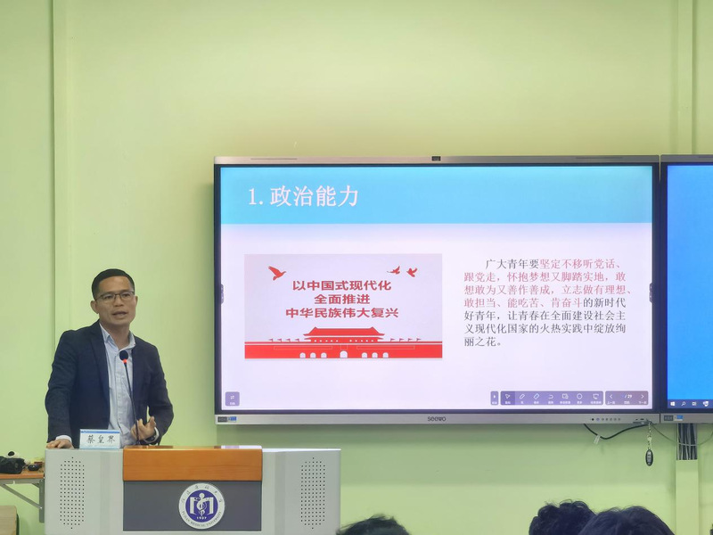 蔡皇界老师以“新时代团学干部的成长进步”为题,分享团学干部的三个密码,学习、服务和成长。围绕学习政治能力、专业能力、工作能力三个方面,引导员工干部树牢学习观念,聚焦服务、创新、团队三个意识,指导员工干部践行知行合一,立足活动实效和锻炼成长两个维度,启发员工干部励志成长成才。蔡皇界老师结合自身成长故事与同学们交流互动,指出员工干部要与时俱进,在保证学习的前提下、在服务同学的过程中,锻炼成长!