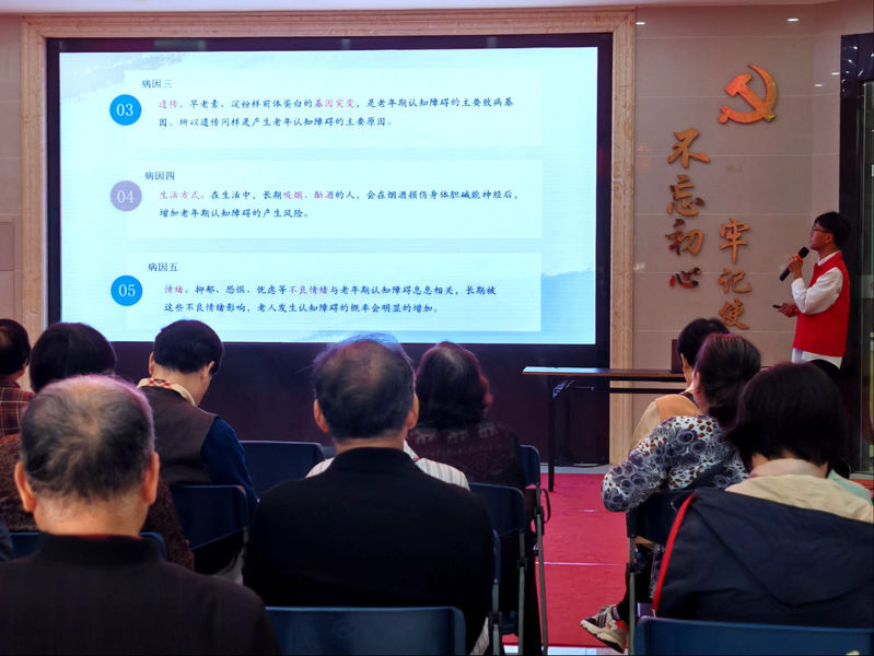 青年志愿者们为到场的30多名老年人,介绍老年人认知障碍的概念、不同类型、具体表现以及预防方法等知识。并通过猜字谜的趣味互动,增进老年入对认知障碍的认识和预防。