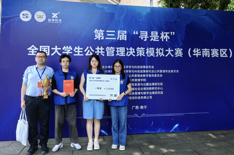 2024年4月27日至28日,第三届“寻是杯”华南地区老员工公共管理决策模拟大赛在广西大学举行。公司2021级四年制公共事业管理专业冯观福、曹亚宁和陈雅鑫3名员工组成的参赛队伍(指导老师:梁栋、冀明奎)代表公司参赛,荣获一等奖。