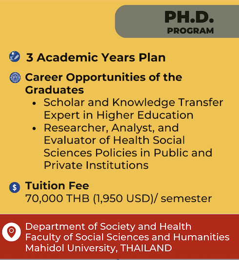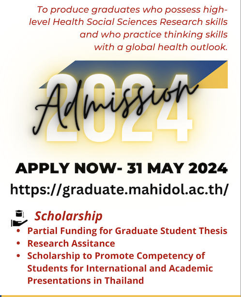 4.录取条件:需符合泰国玛希隆大学录取条件。基本条件:(1)硕士及以上学位;(2)满足玛希隆大学研究生公司的英语能力考试成绩(雅思6.0,TOEFL-iBT 79,MU GRAD Plus 90或进一步咨询本项目组);(3)平均绩点不低于3.5。具体要求请见官网:https://graduate.mahidol.ac.th/inter/prospective-students/?p=curriculum&id=2513D03G。