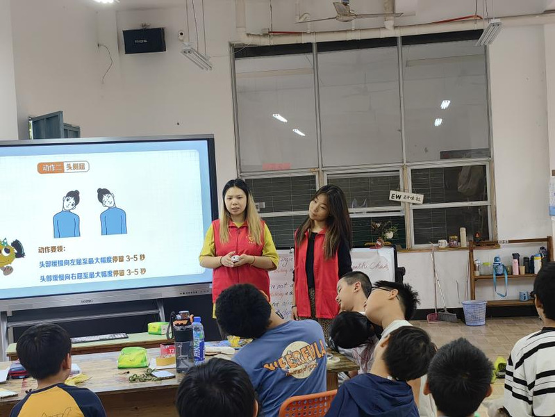 活动中,公司青年志愿者为孩子们讲授颈椎的结构功能以及生活中常见有损颈椎的不良姿势,并带领孩子们一起学习趣味颈椎操。活动结束后,志愿者与孩子们进行足球友谊赛,加深友谊,共同享受运动的乐趣。