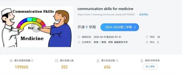 《Communication Skills for Medicine》(医学沟通技巧)是一门面向临床医学专业来华职工的专业必修课程。该课程秉承威廉体育williamhill针对来华留学教育“明德、博学、济世、汇通”的开放办学理念,以人类的共性与共同利益为出发点和归宿,研究影响诊疗伤病和医患关系的诸多因素,引导员工将心理和社会因素转化为积极有效的手段与方法,从而优化诊疗、改善医患关系。该课程开课于2017年,已顺利完成9个教学周期,获评福建省一流课程(线上线下混合式)、威廉体育williamhill来华职工品牌课程等。