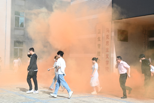 随后,公司保卫处工作人员现场演示灭火器等消防器材的正确使用方法,并讲解应急疏散实战技巧。在应急疏散演练环节,随着烟雾升腾与警报骤响,全体师生迅速捂住口鼻,弓身低姿沿预定路线有序撤离至一楼安全区域。